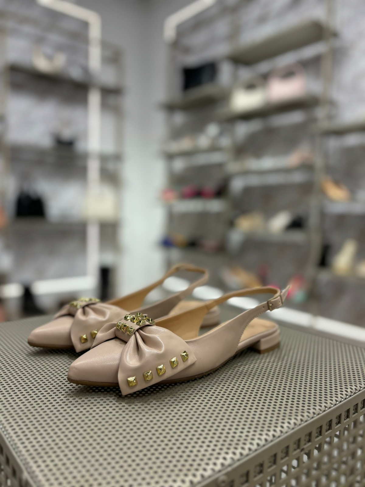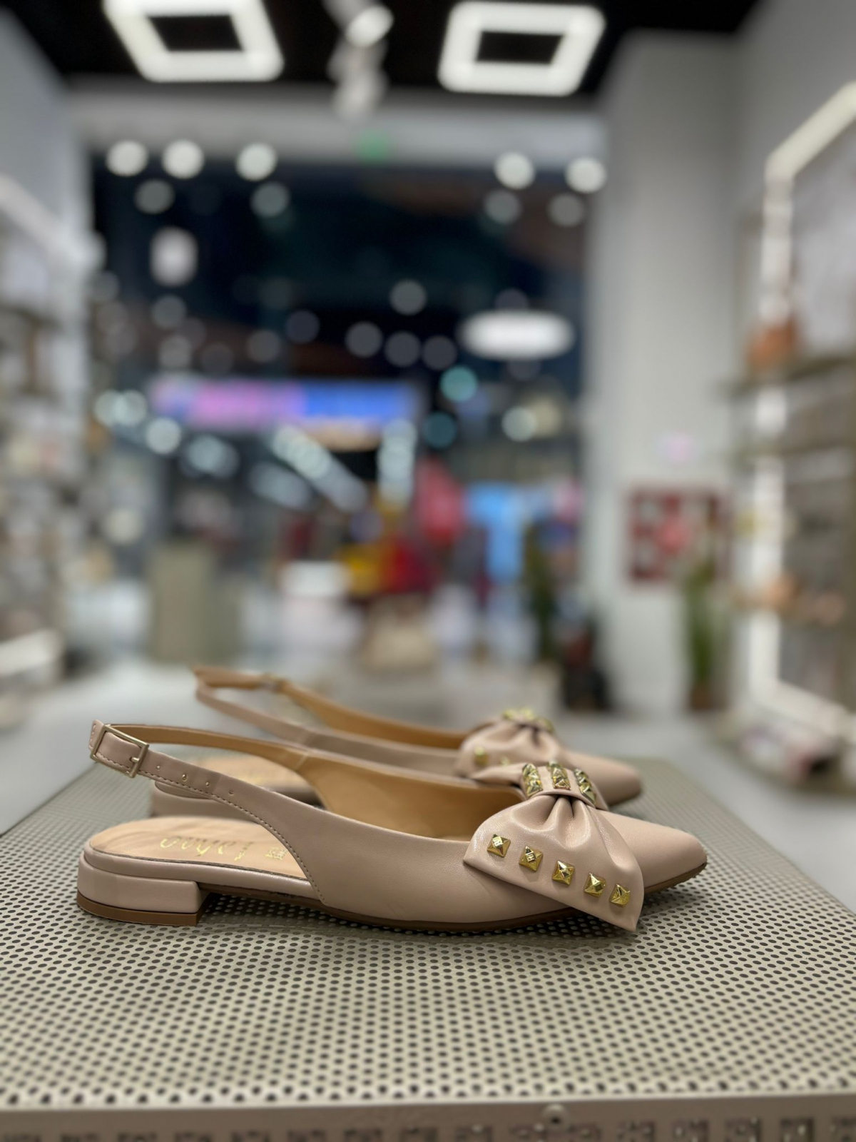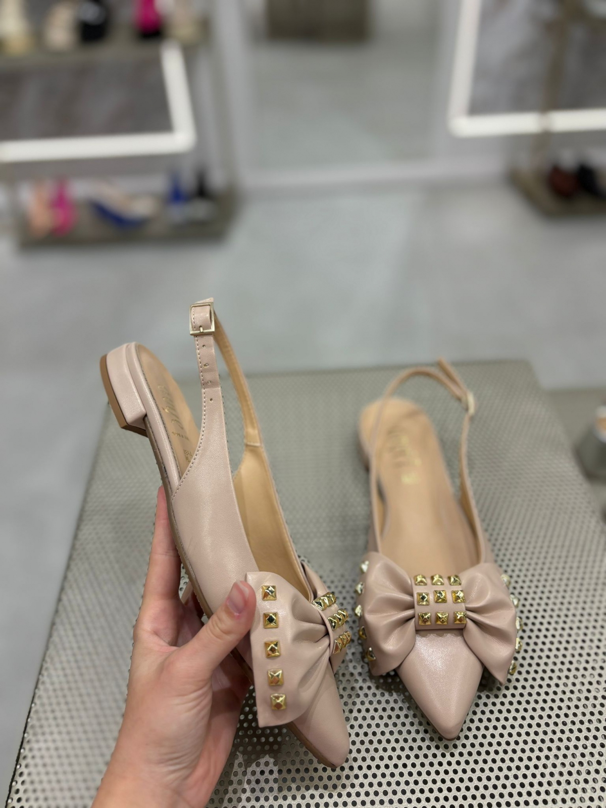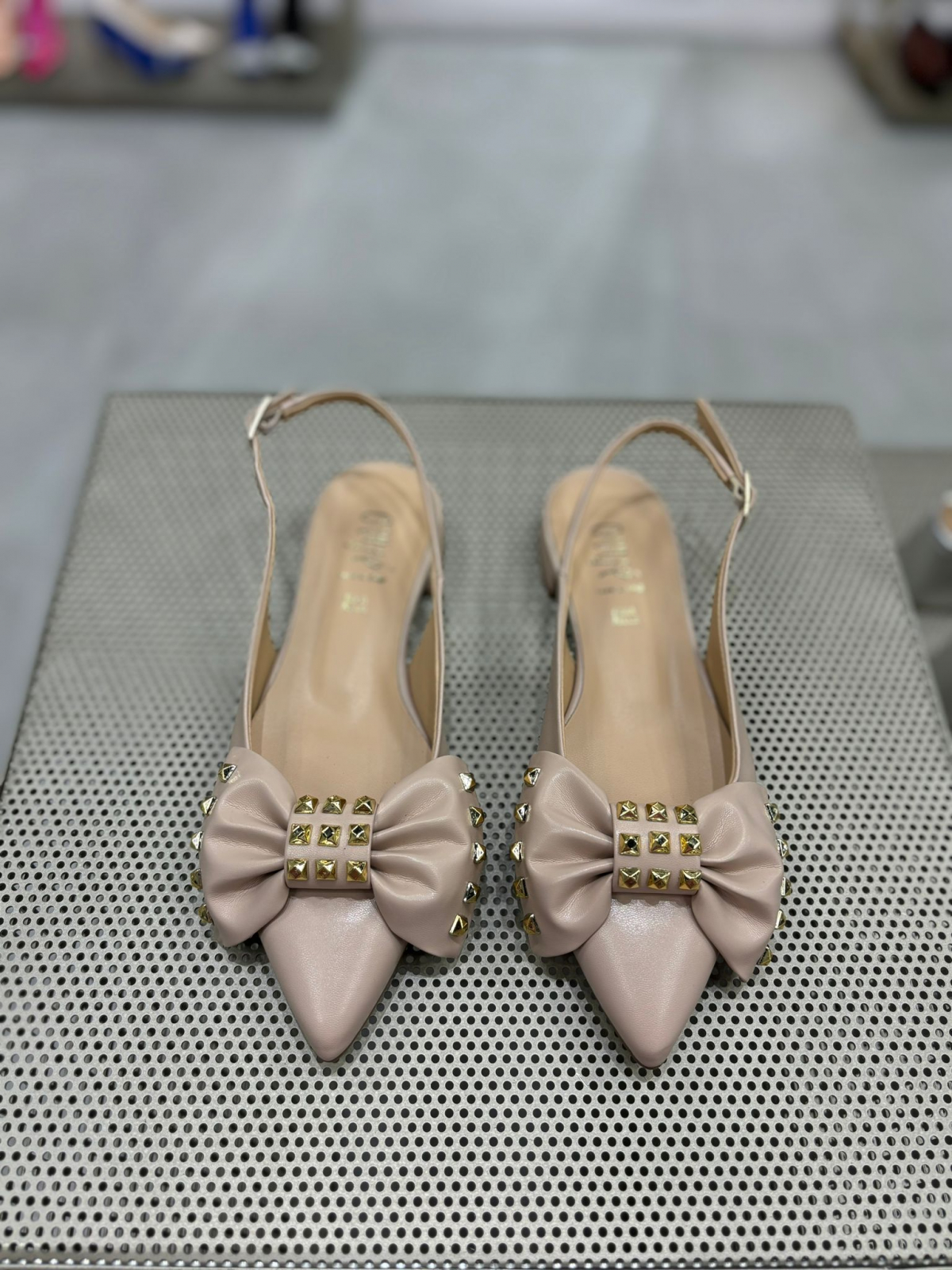 Balerini nude decupati la spate cu bareta ajustabila din catarama metalica. Sunt accesorizati cu o funda ce are aplicatii metalice aurii ce ofera un aspect unicat. Sunt foarte confortabili si potriviti atat la rochii cat si la pantaloni eleganti de zi cu zi.