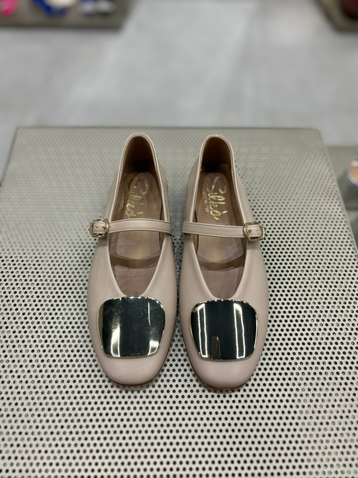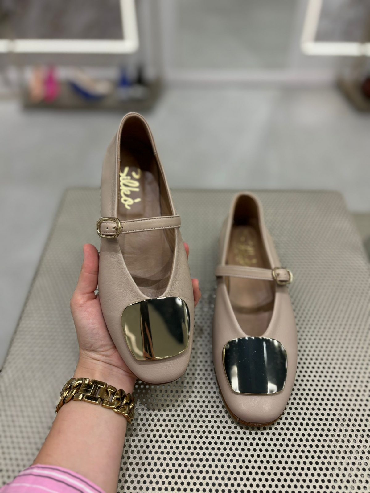 Balerini nude din piele extra fina, varf rotund accesorizat cu o catarama aurie metalica ce ofera un aspect unicat. Au bareta reglabila cu catarama metalica pentru stabilitate pe picior, iar tocul de 1 cm ofera eleganta si stabilitate. Sunt perfecti de zi cu zi la rochii si pantaloni.