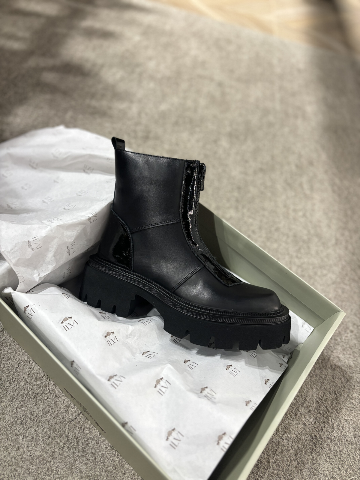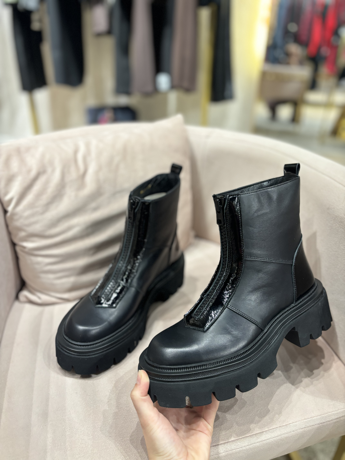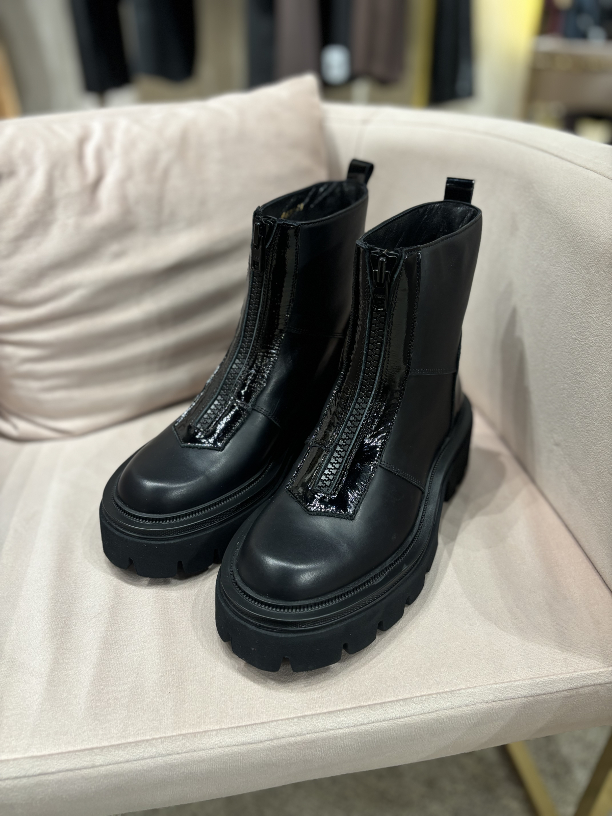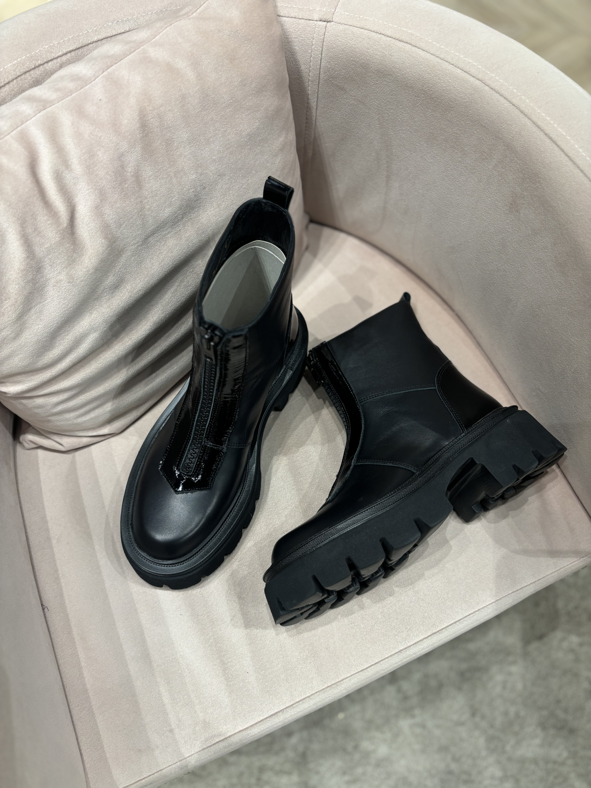 Ghete realizate din piele naturala extra fina cu interior captusit cu blanita eco. Inchiderea este cu fermoar in partea din fata ce ofera si un aspect unicat. Este un model realizat cu o talpa din spuma foarte usoara si confortabila ce poate fi purtat de zi cu zi la tinute elegant-casual.
