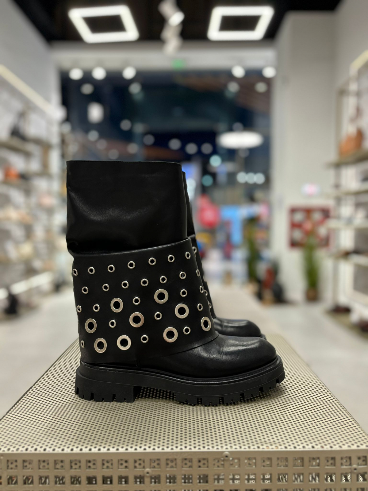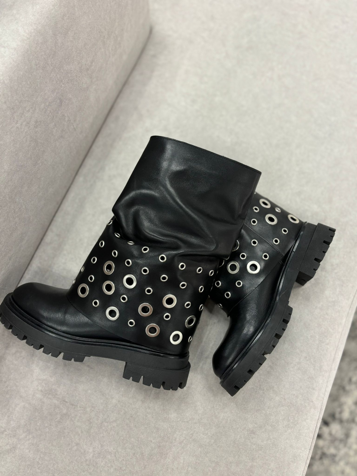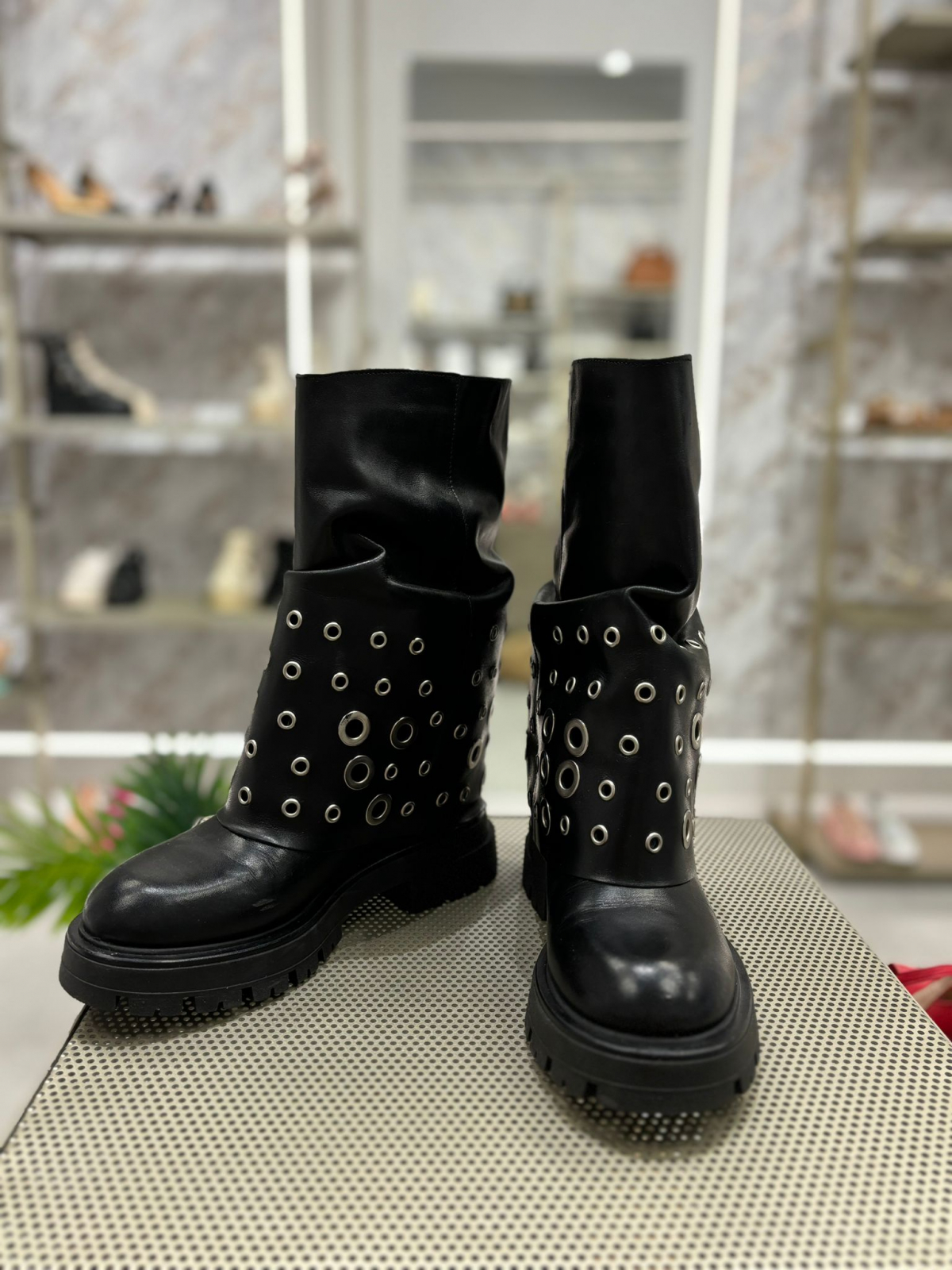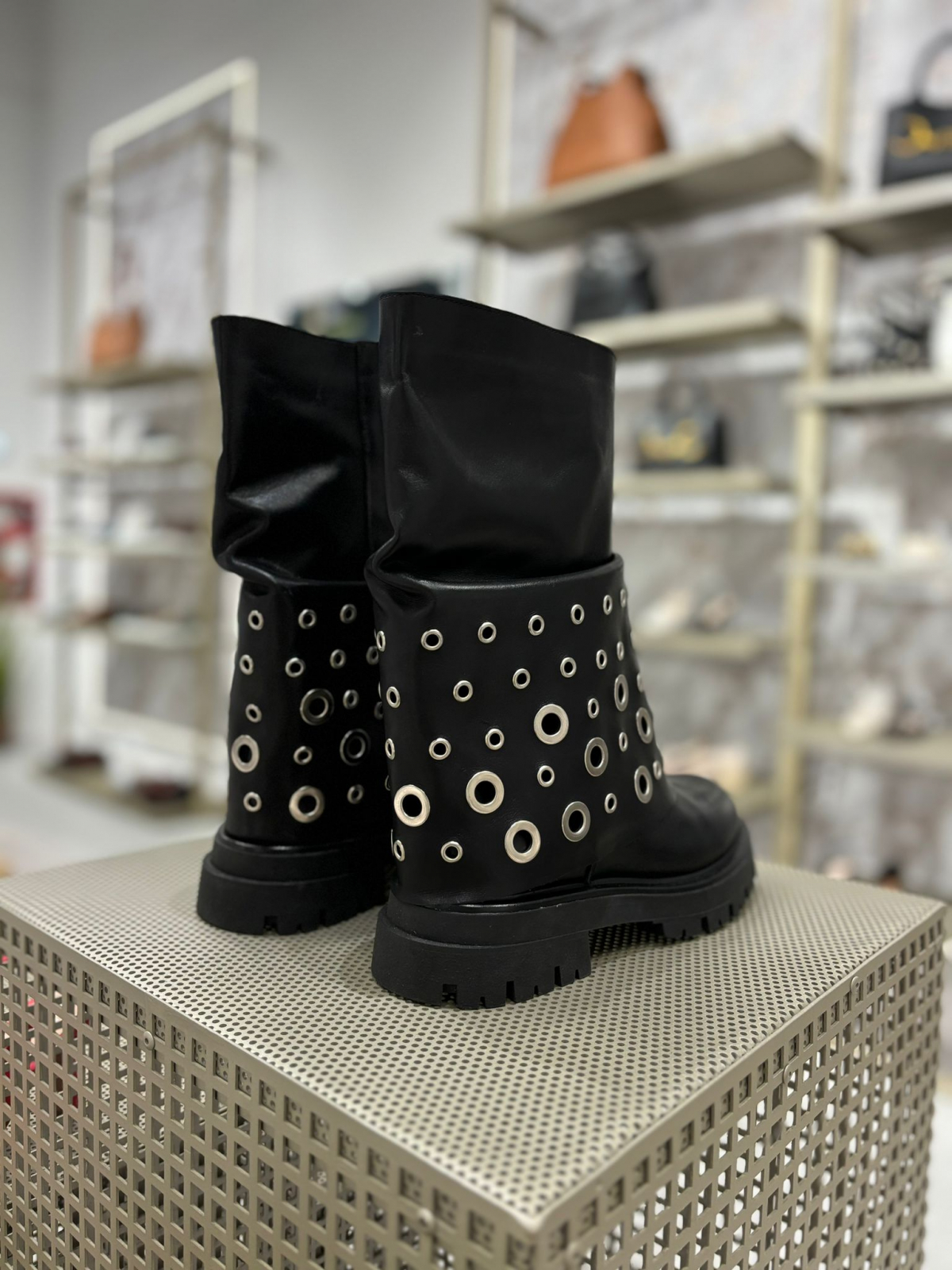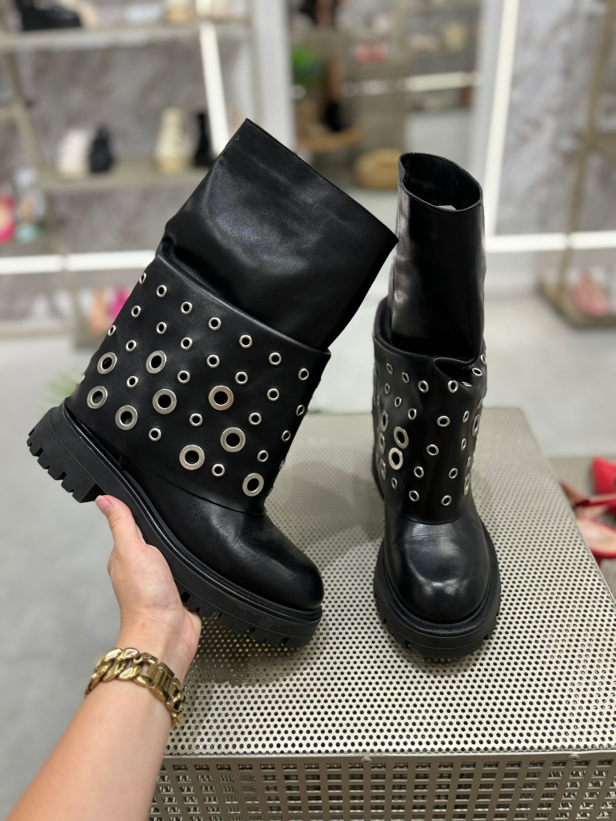 Cizme realizate din piele naturala cu varf rotund si talpa din caucaiuc flexibil. Sunt accesorizate cu extensie din piele deasupra si detalii metalice perforate ce ofera un aspect unicat. Sunt perfecte la tinutele de zi cu zi la pantaloni sau rochii casual cat si la tinutele de festival.
