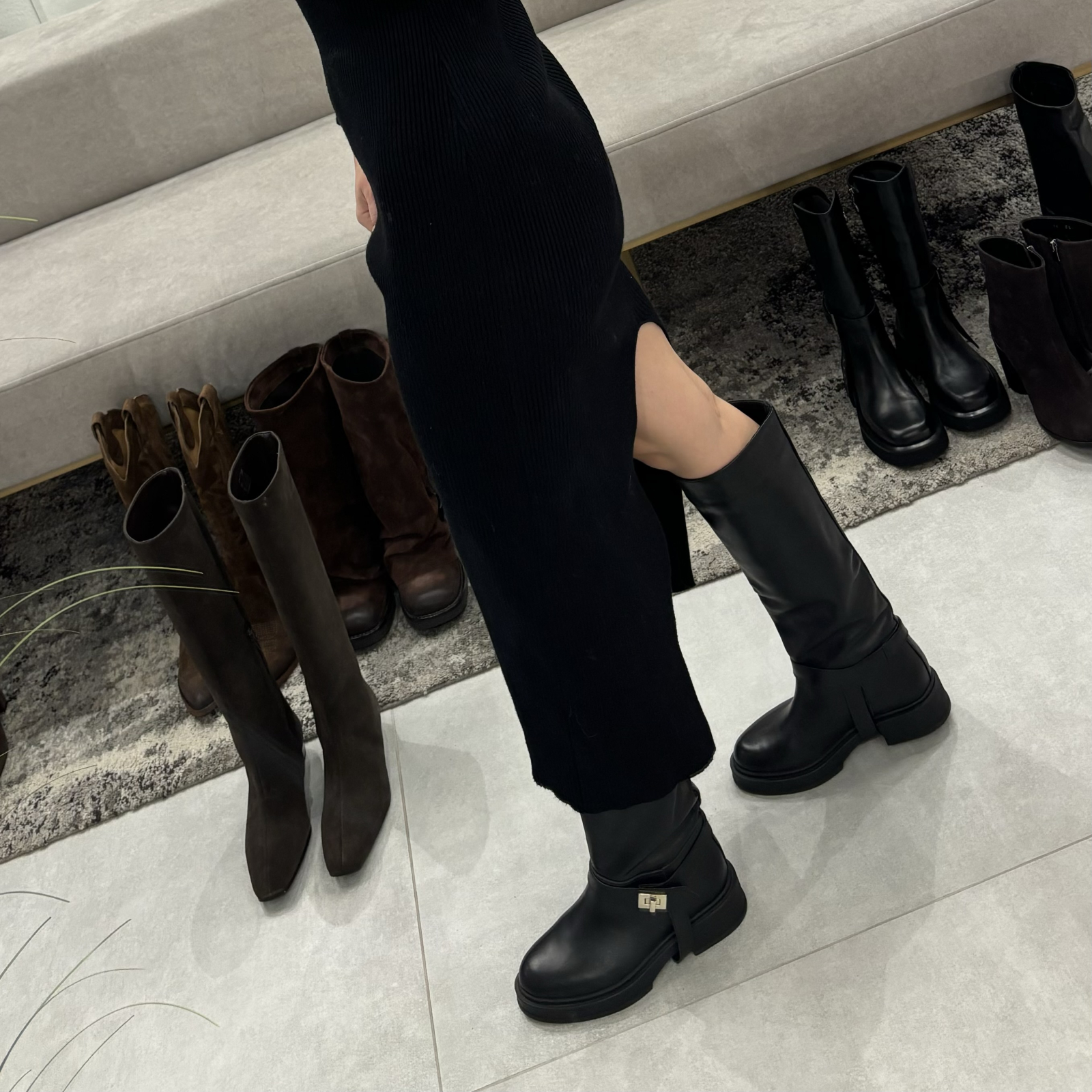 Cizme model tubular realizate din piele naturala interior-exterior cu catarama din piele detasabila. Talpa este realizata din cauciuc flexibil ce ofera confort si stabilitate. Este un model perfect pentru tinutele elegant-casual de zi cu zi.