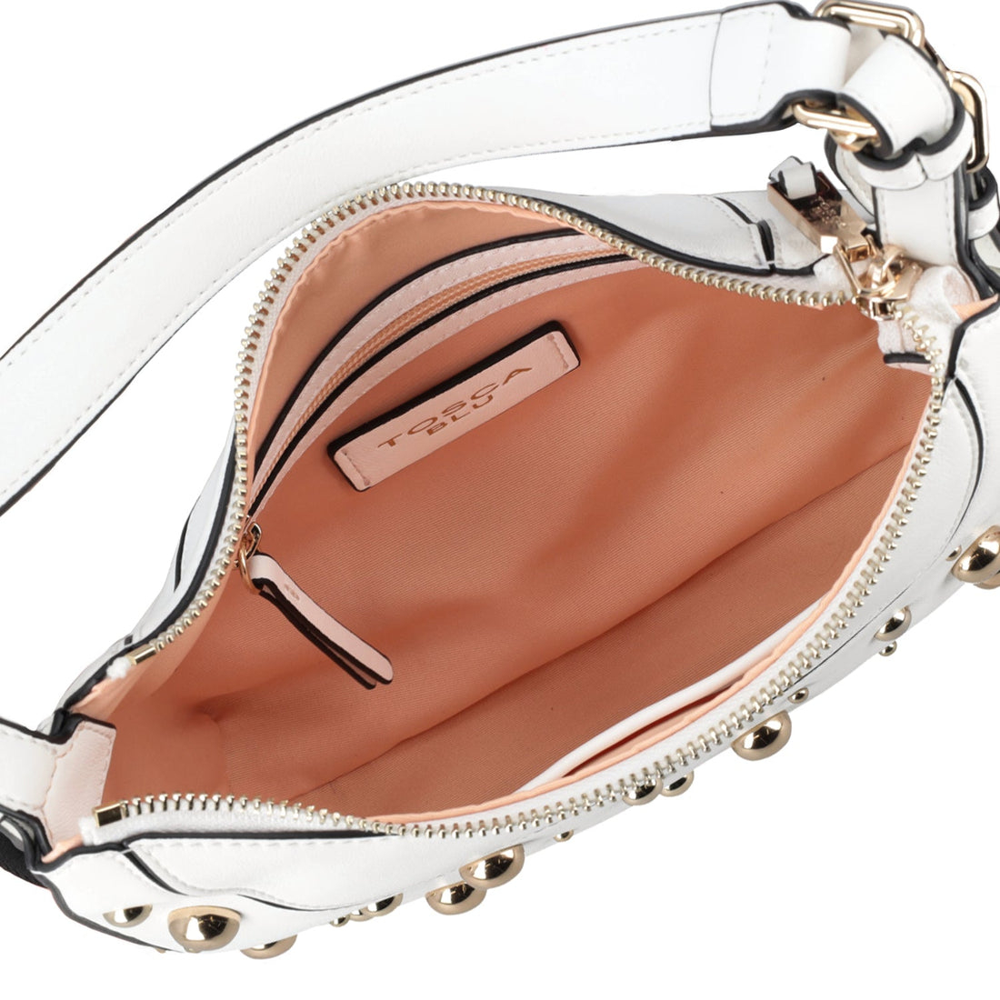 Geanta realizata din ecopiele cu bareta textila reglabila din catarama metalica. Geanta este accesorizata cu aplicatii metalice aurii. Este un model foarte potrivit tinutelor casual de zi cu zi atat la rochii cat si la pantaloni.