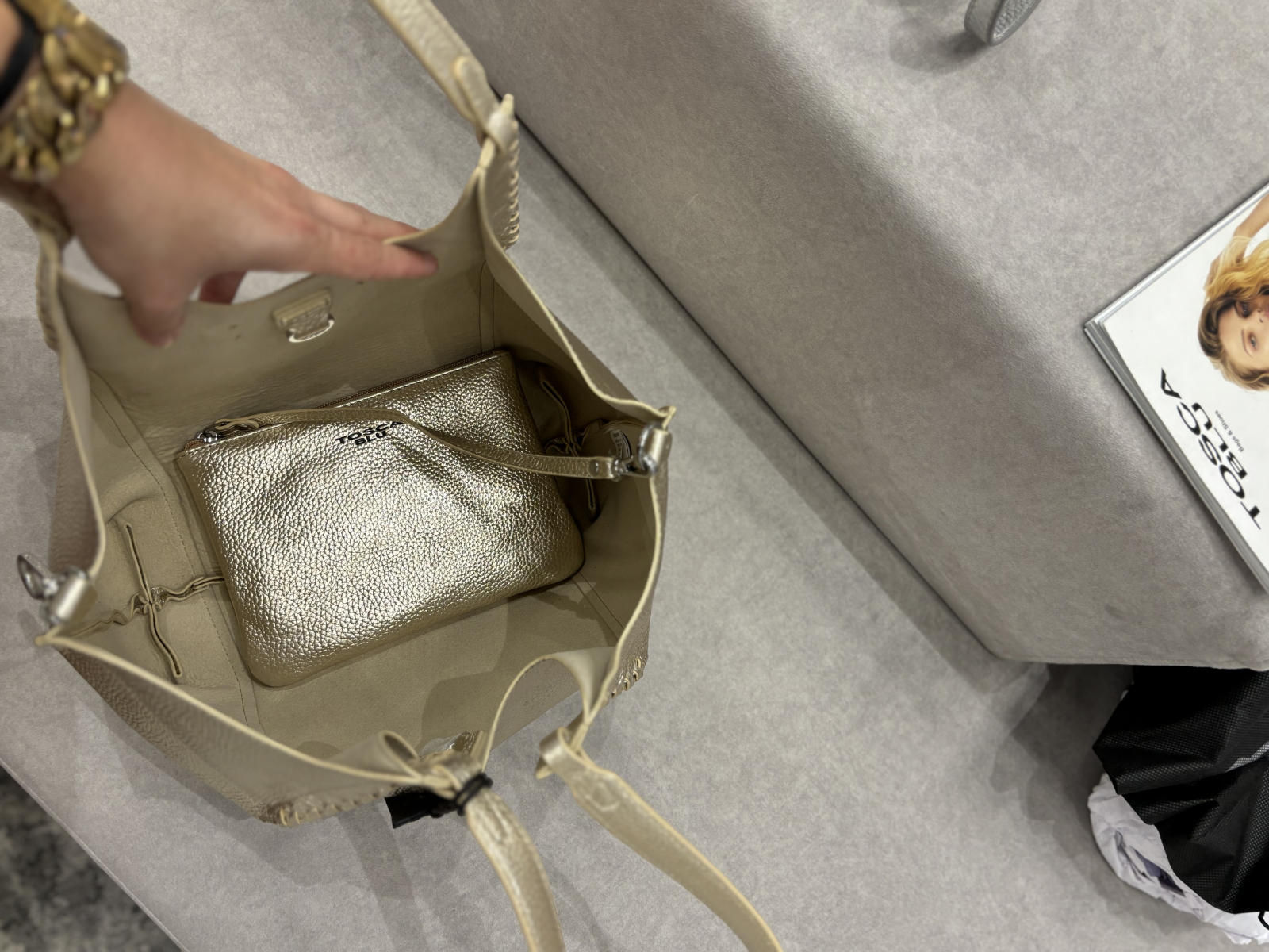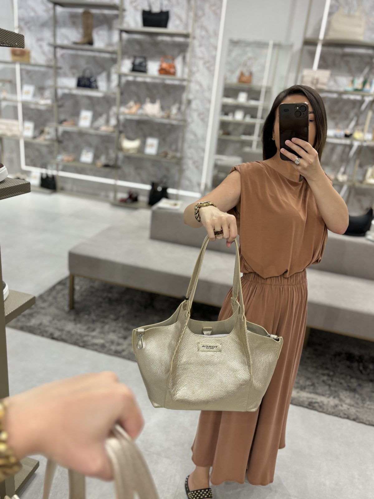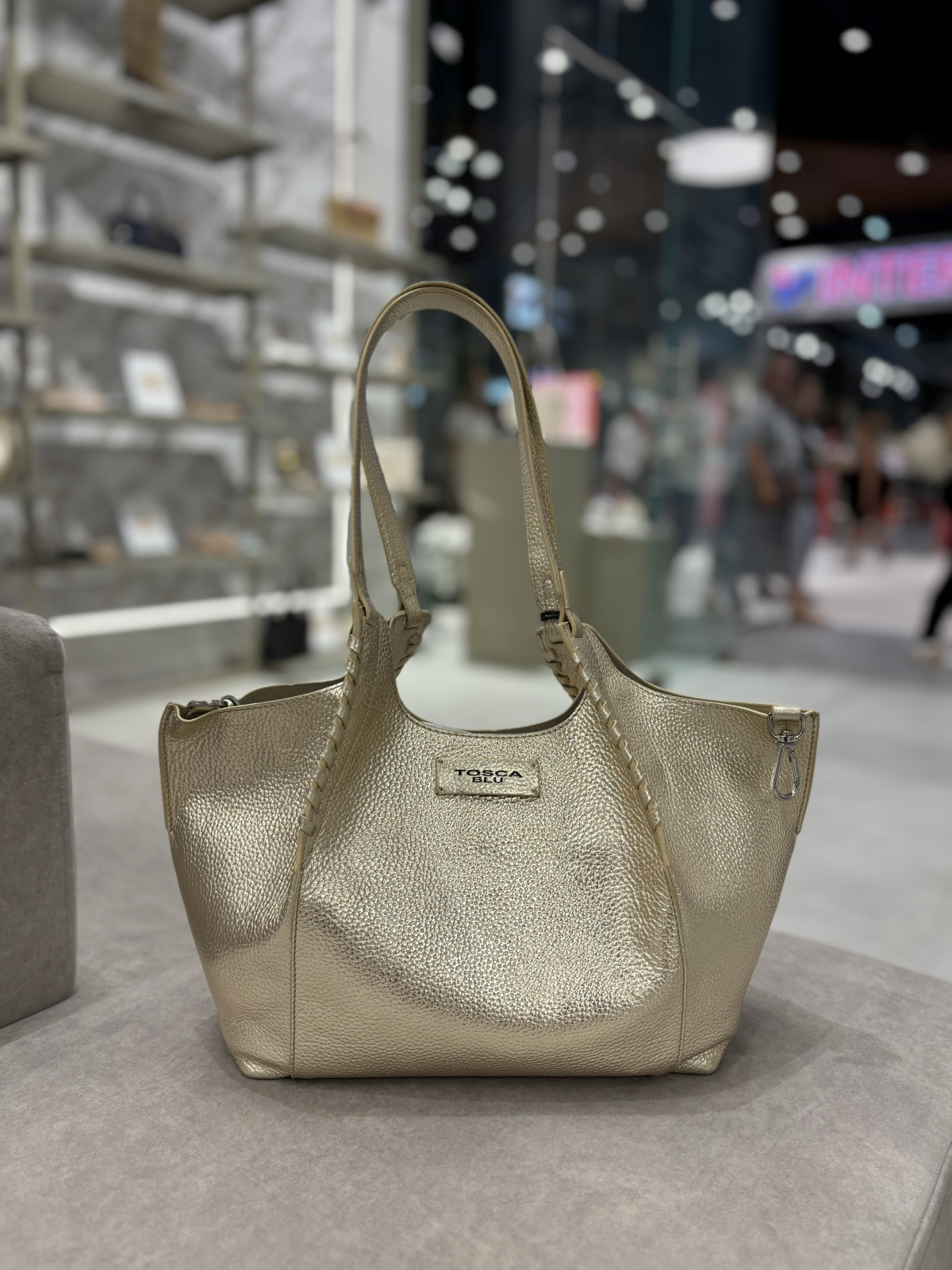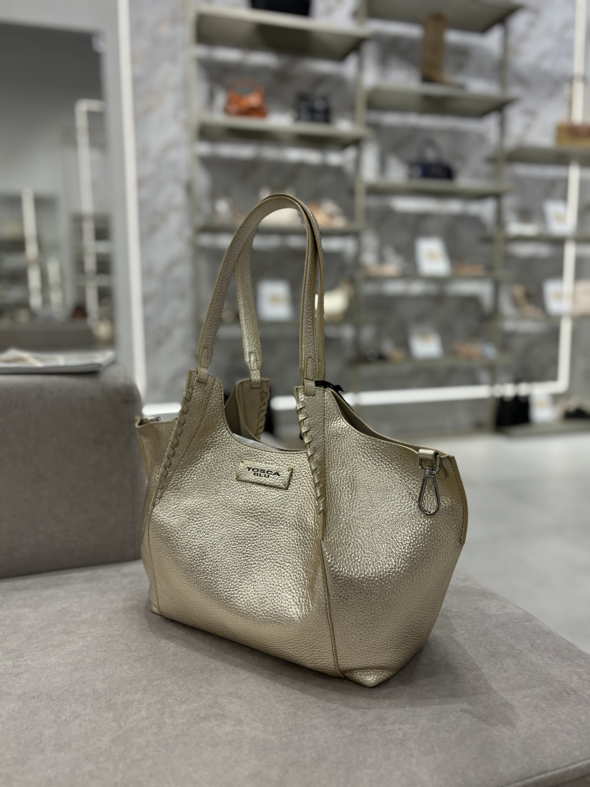 Geanta realizata din piele naturala 100% de culoare auriu metalic cu portmoneu detasabil in interior. Geanta este foarte usoara pentru purtarile de zi cu zi cu un acces foarte rapid in interiorul ei. Este perfecta pentru tinutele de zi cu zi cat si la o tinuta de vacanta. Are un aspect elegant-casual potrivita atat la rochii cat si la pantaloni.