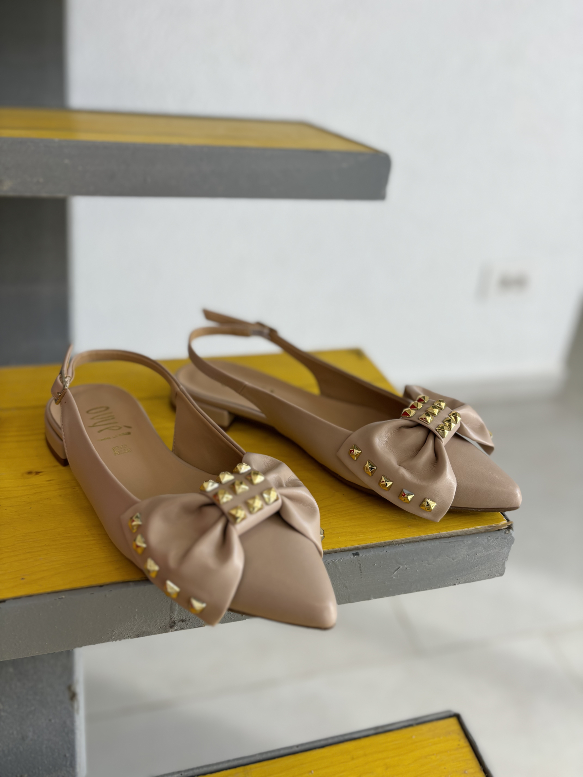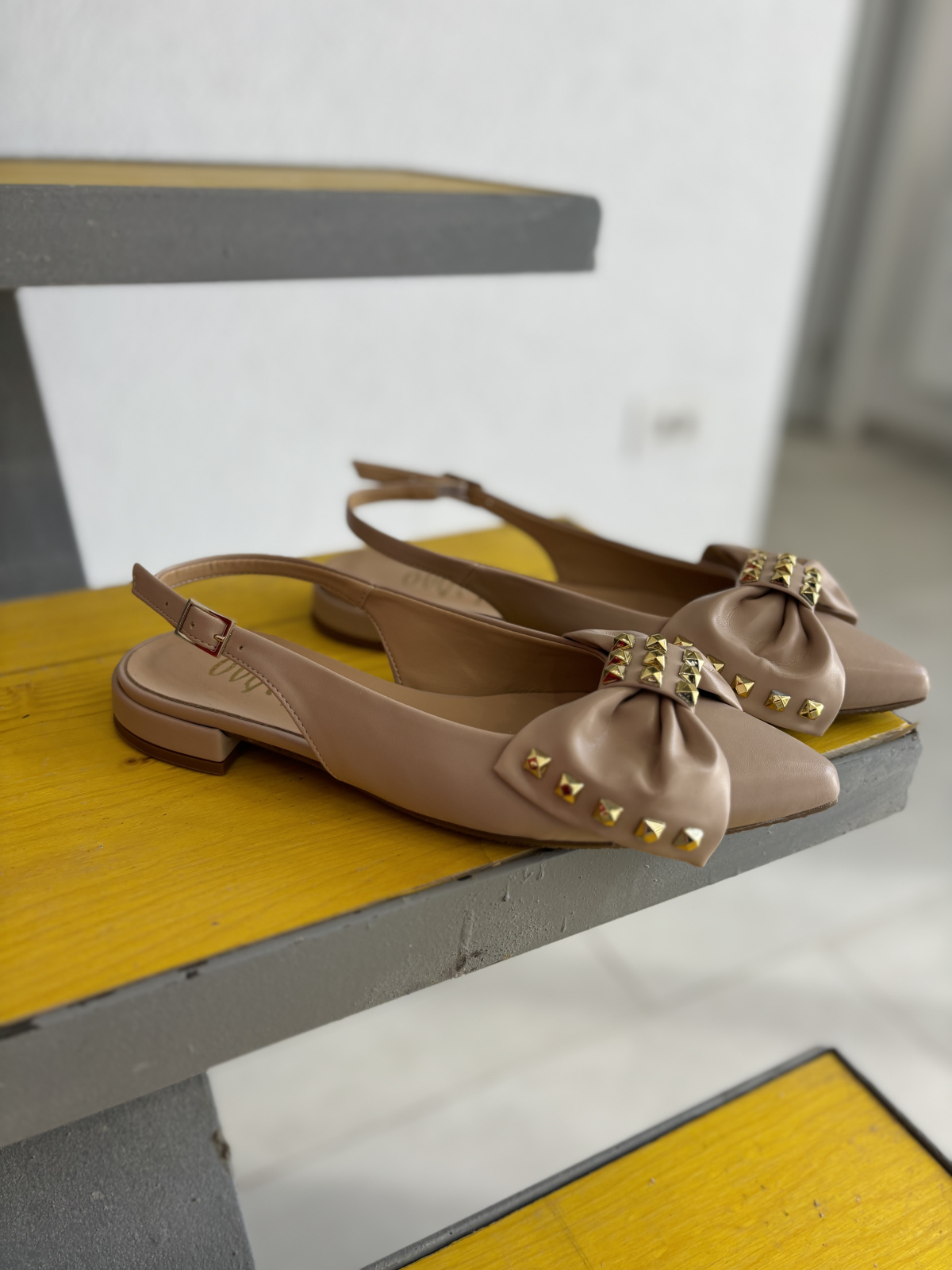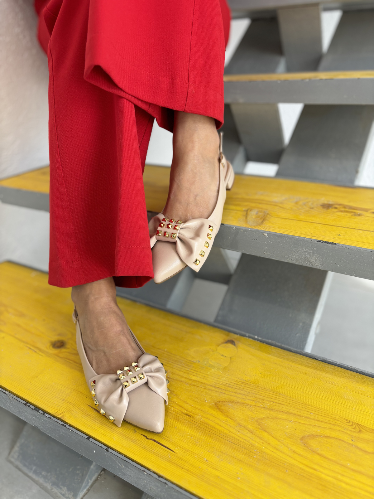 Balerini nude decupati la spate cu bareta ajustabila din catarama metalica. Sunt accesorizati cu o funda ce are aplicatii metalice aurii ce ofera un aspect unicat. Sunt foarte confortabili si potriviti atat la rochii cat si la pantaloni eleganti de zi cu zi.