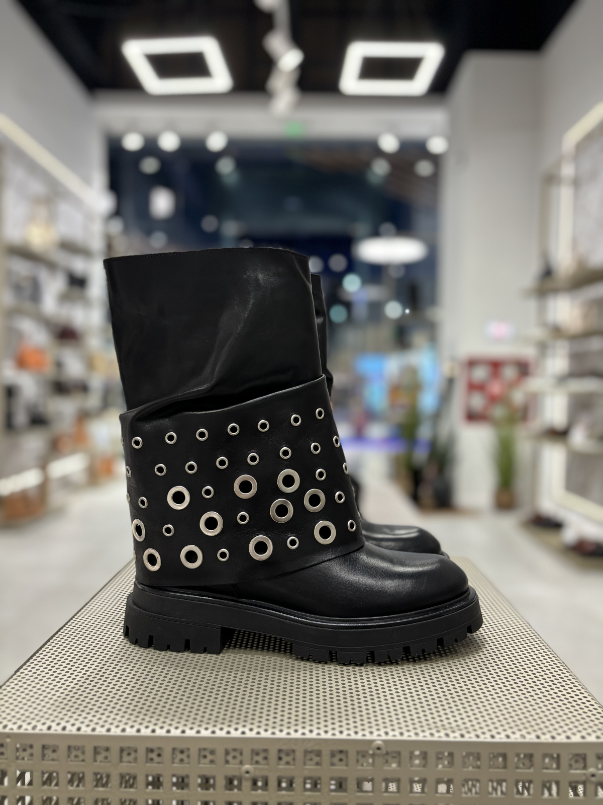 Gheata realizate din piele naturala cu extensie de piele deasupra accesorizata cu detalii metalice ce ofera un aspect unicat. Lungimea ghetei este pana la jumatatea gambei, talpa este realizata din cauciuc flexibil. Este un model ce poate fi purtat de zi cu zi atat la pantaloni cat si la tinute cu fuste sau rochii mai nonconformiste.