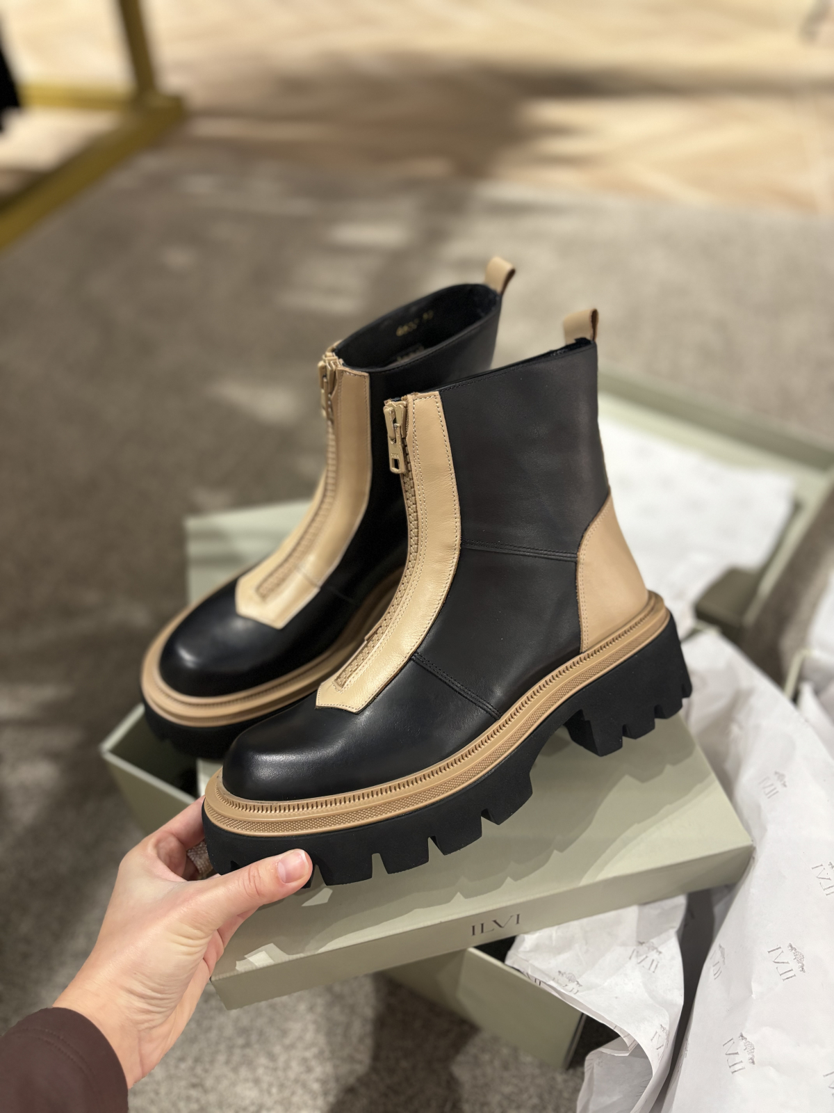 Ghete realizate din piele naturala extra fina cu interior captusit cu blanita eco. Inchiderea este cu fermoar in partea din fata ce ofera si un aspect unicat. Este un model realizat cu o talpa din spuma foarte usoara si confortabila ce poate fi purtat de zi cu zi la tinute elegant-casual.