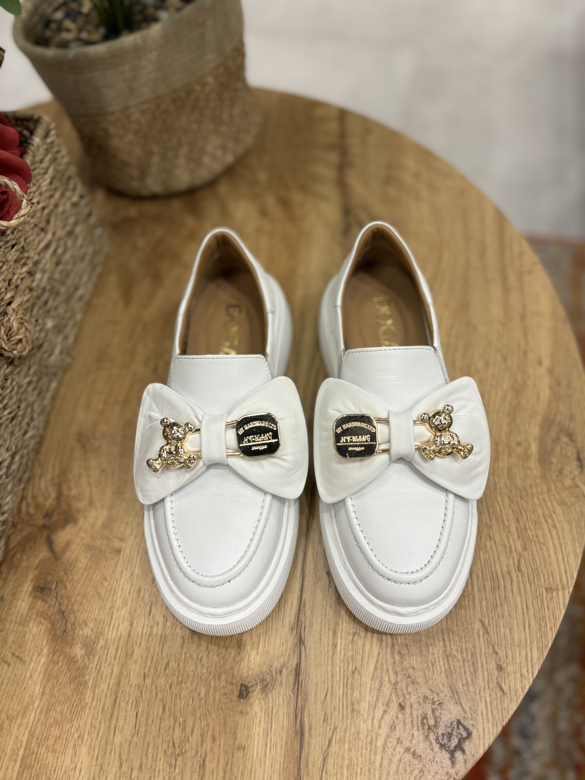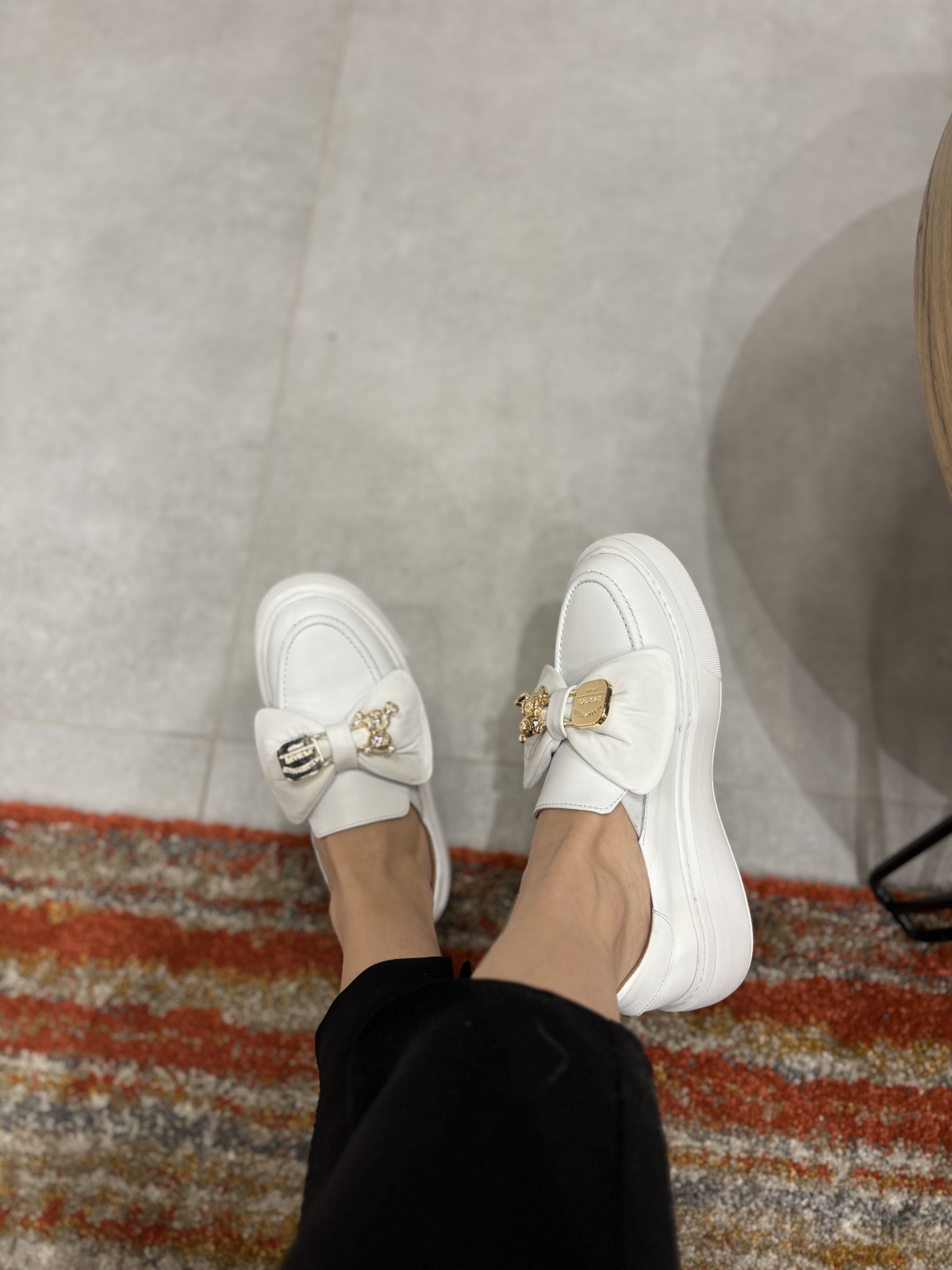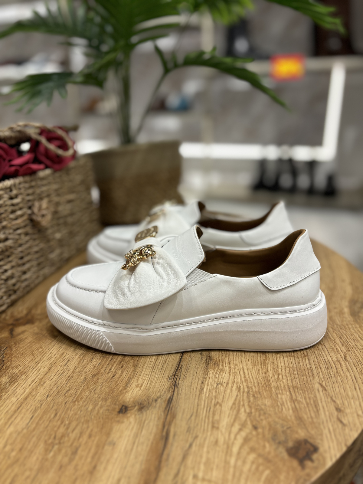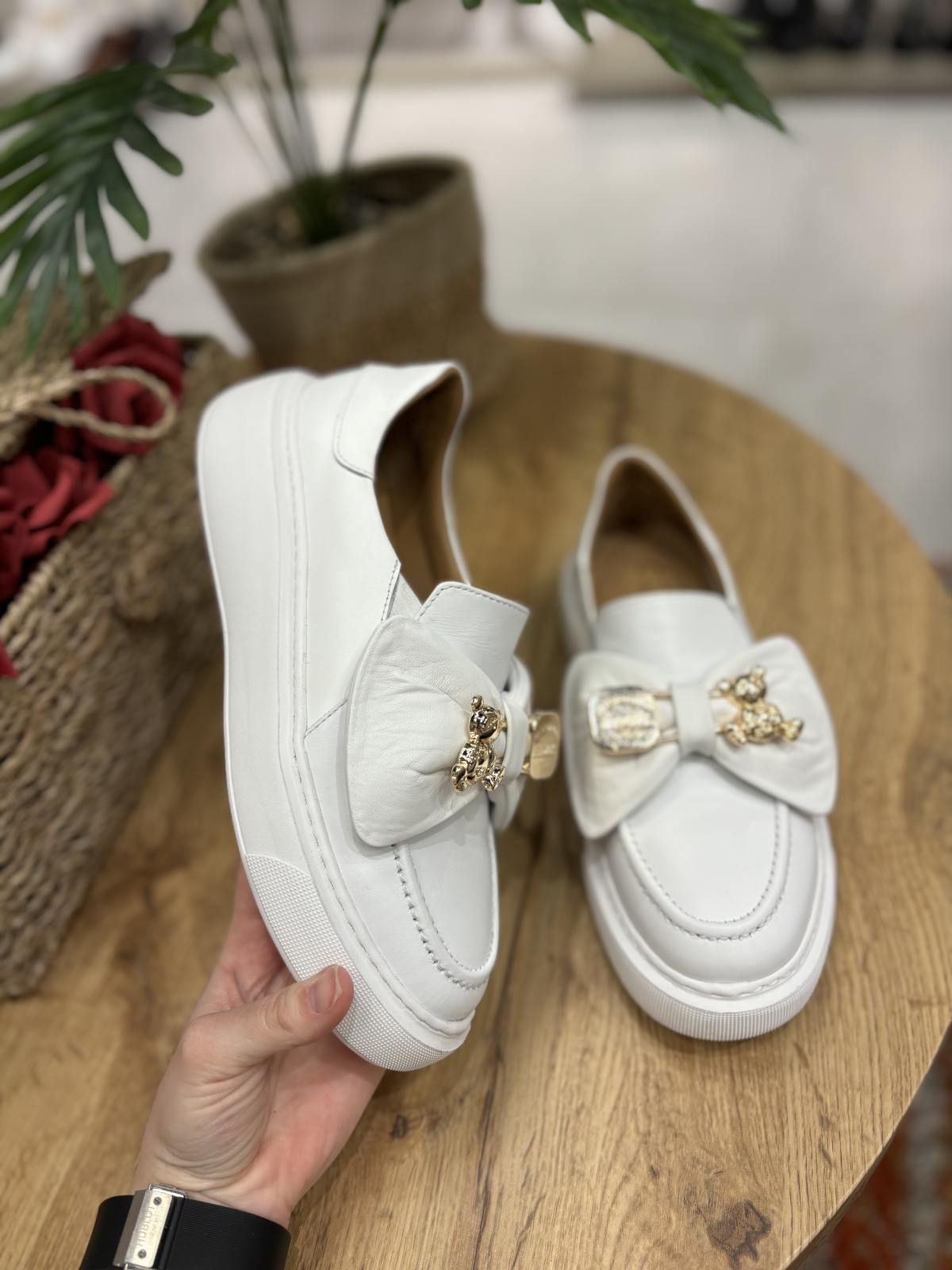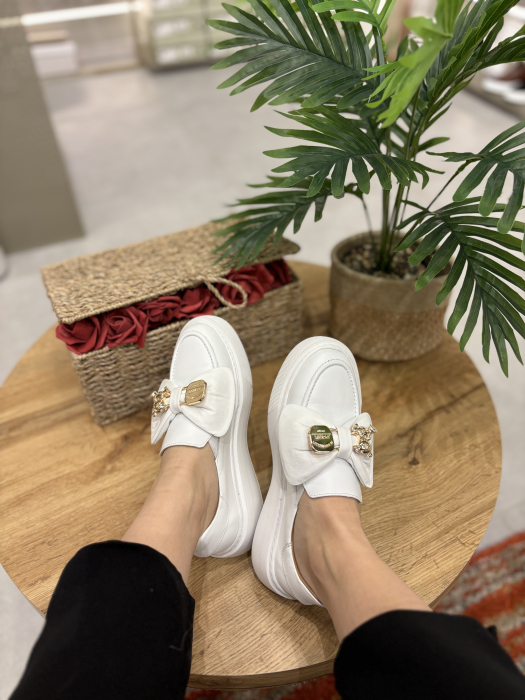 Mocasini realizati din piele naturala interior-exterior cu accesoriu tip funda realizat din piele si detaliu metalic auriu. Talpa este realizata din spuma confort ce ofera stabilitate si confort pe tot parcursul zilei. Este un model disponibil pe 2 culori si foarte versatil atat la tinute elegante cat si casual.