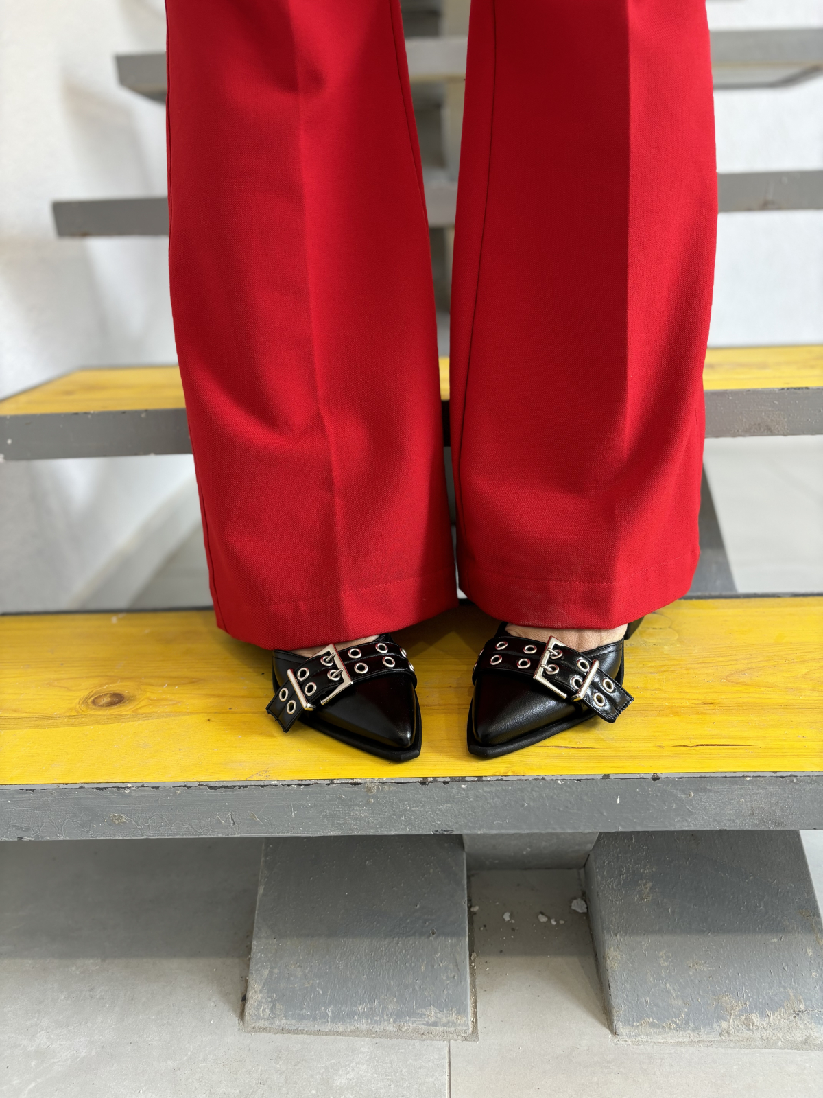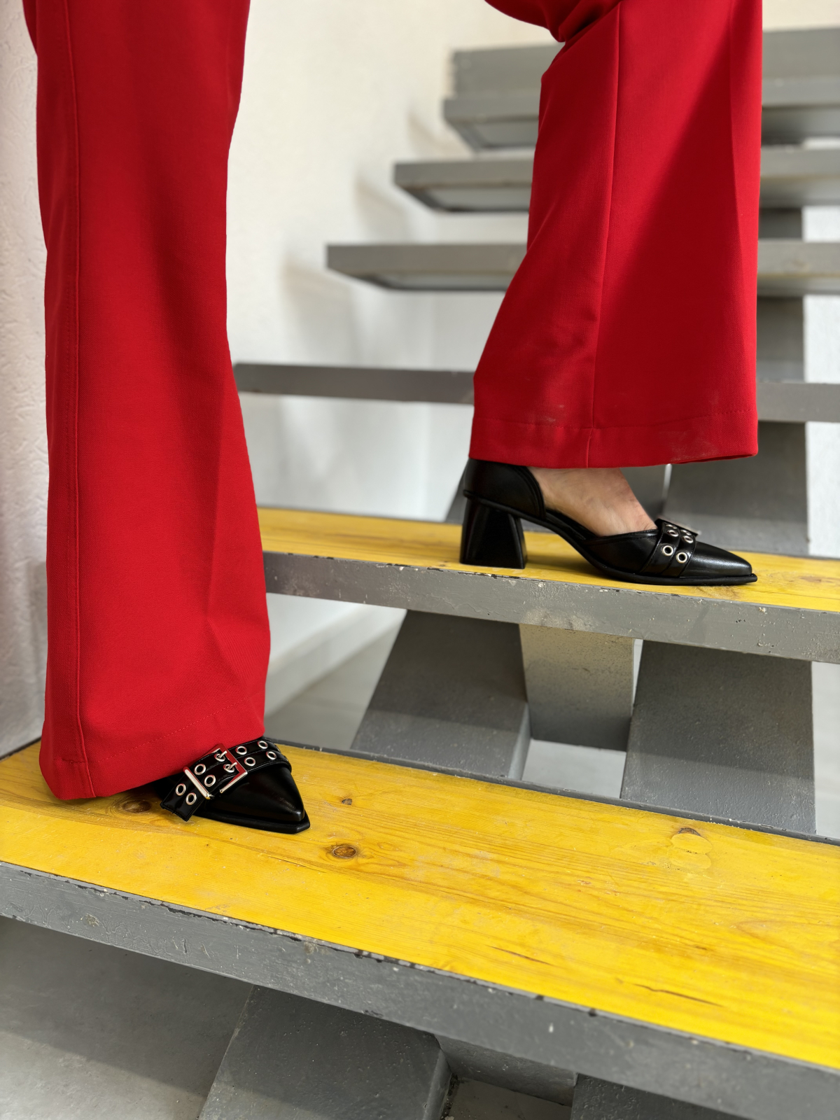 Pantofi negri din piele naturala cu toc bloc foarte stabil de 7 cm. Au varful usor ascutit si accesorizat cu o catarama cu detalii metalice. Pe glezna au o bareta ajustabila din catarama metalica. Sunt foarte potriviti la tinute de zi cu zi atat la rochii cat si la pantaloni sau jeans.
