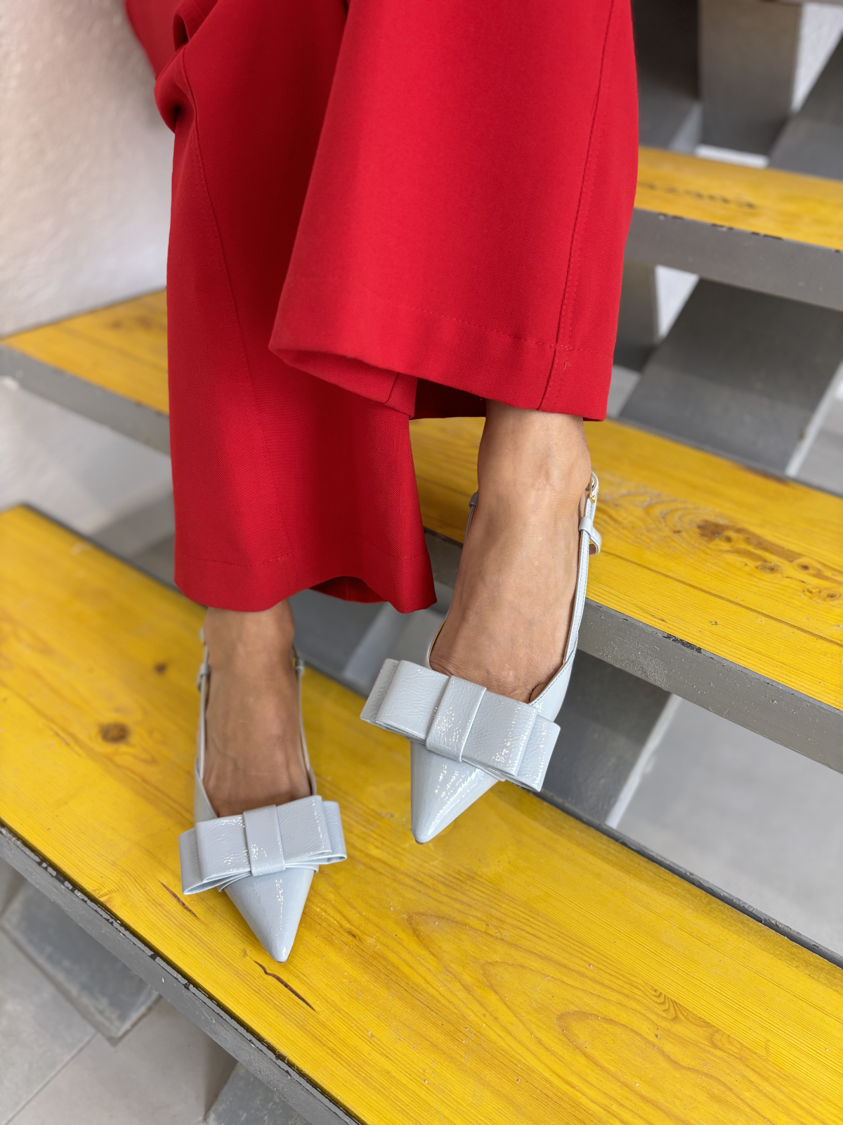 Pantofi bleu cu varf usor ascutit din piele lacuita. Sunt cu bareta la spate, reglabili cu catarama metalica. Sunt accesorizati cu funda din piele ce ofera unicitate, iar tocul de 5 cm ofera eleganta si confort. Sunt foarte potriviti la tinute de eveniment sau tinute office.