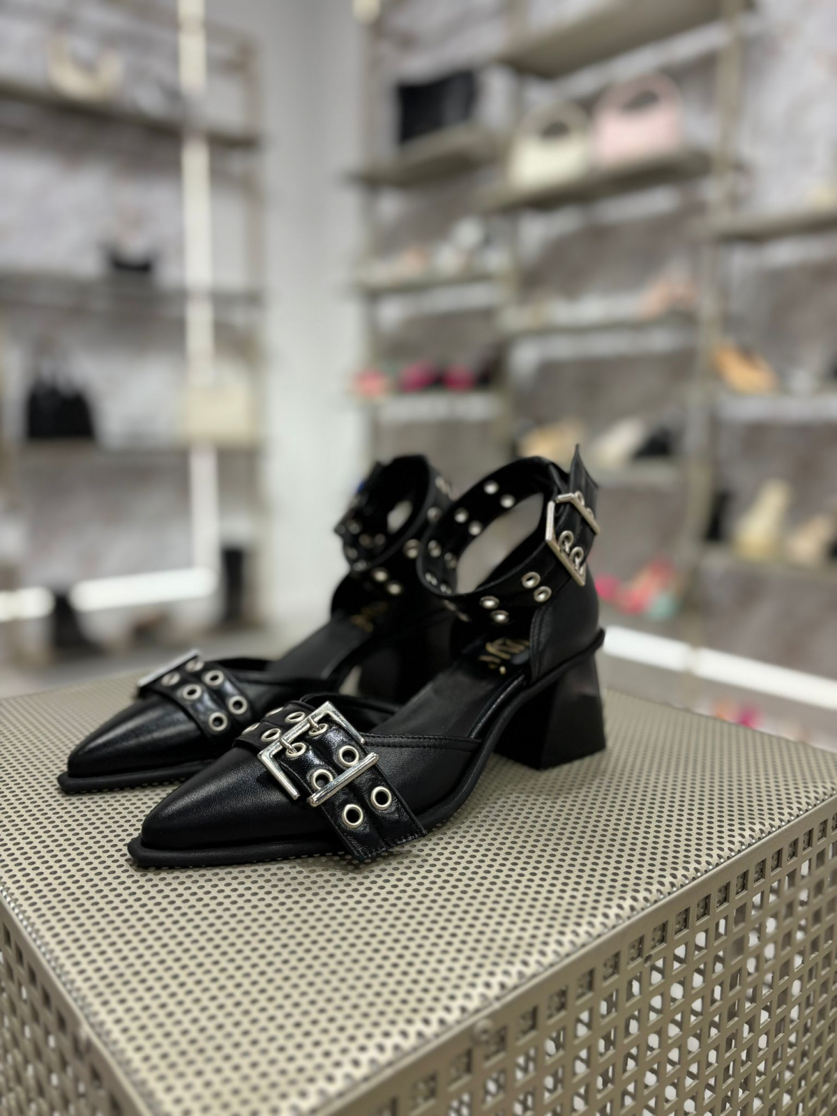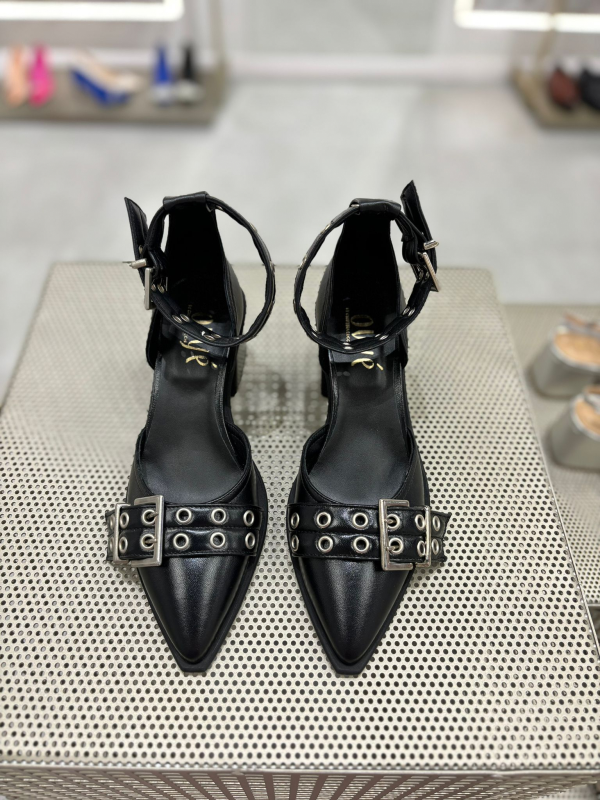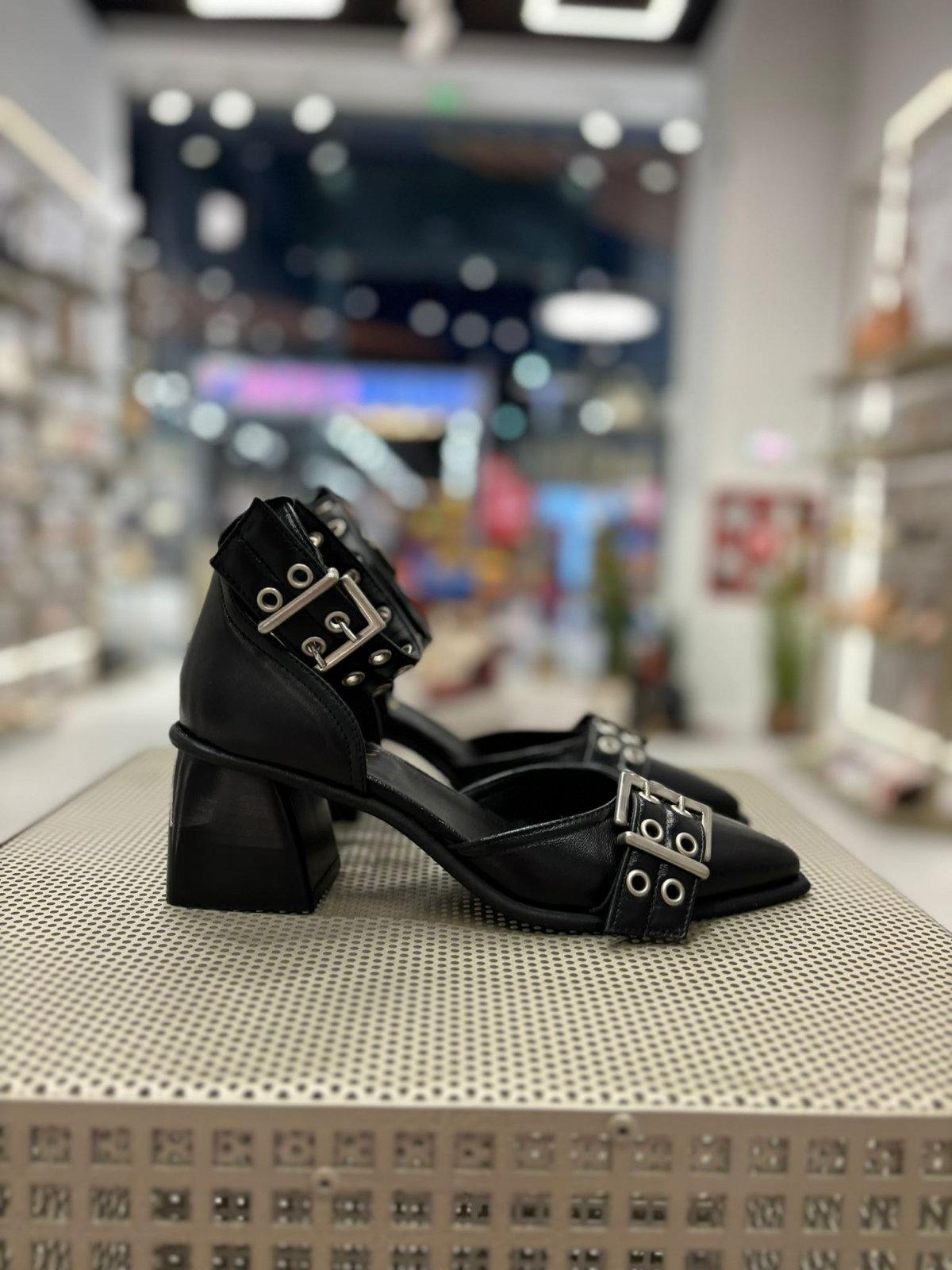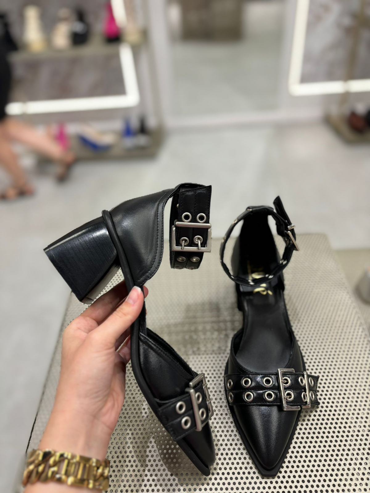Pantofi negri din piele naturala cu toc bloc foarte stabil de 7 cm. Au varful usor ascutit si accesorizat cu o catarama cu detalii metalice. Pe glezna au o bareta ajustabila din catarama metalica. Sunt foarte potriviti la tinute de zi cu zi atat la rochii cat si la pantaloni sau jeans.