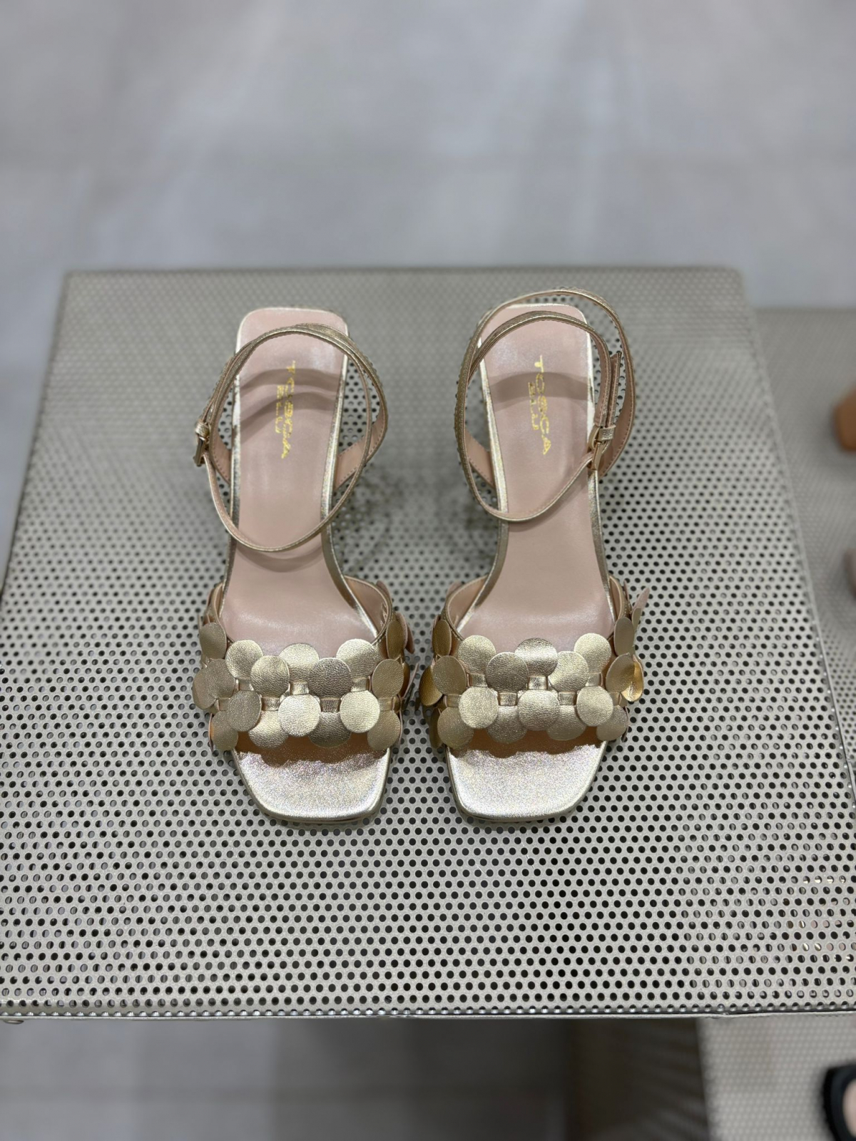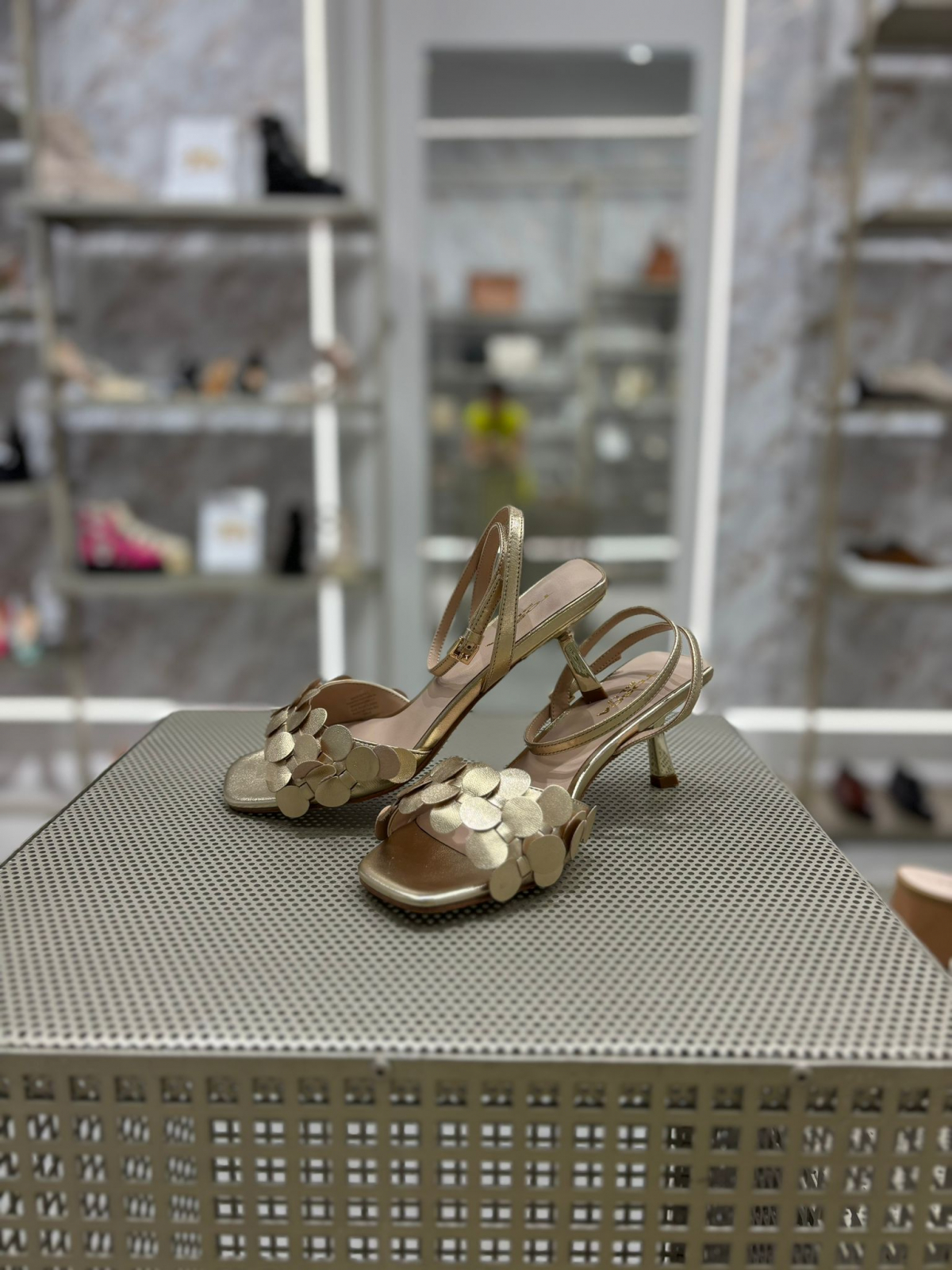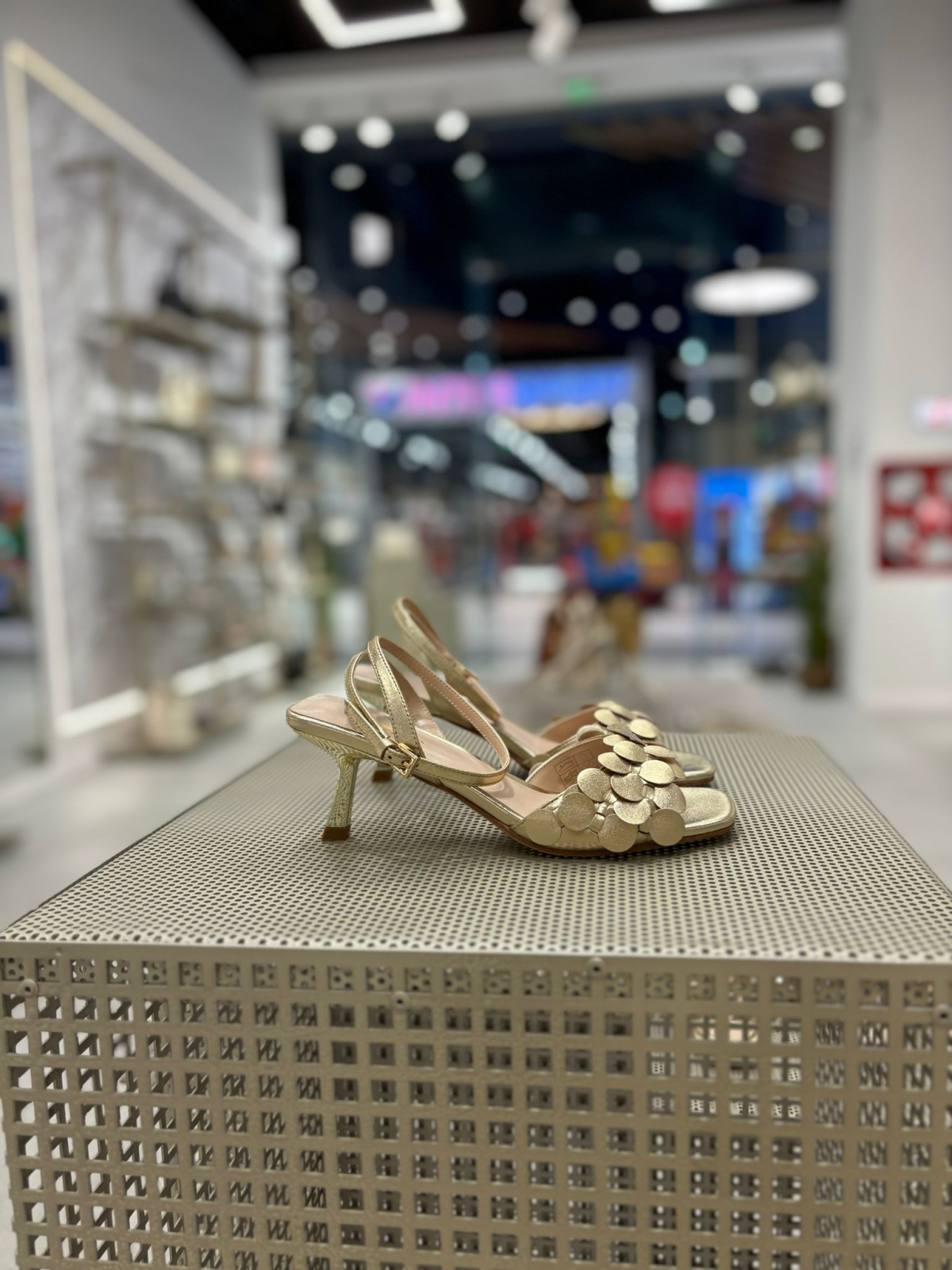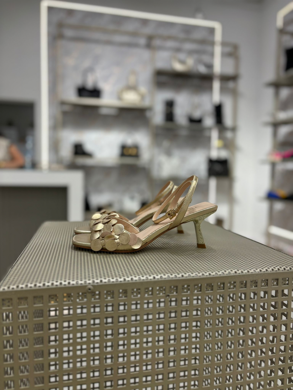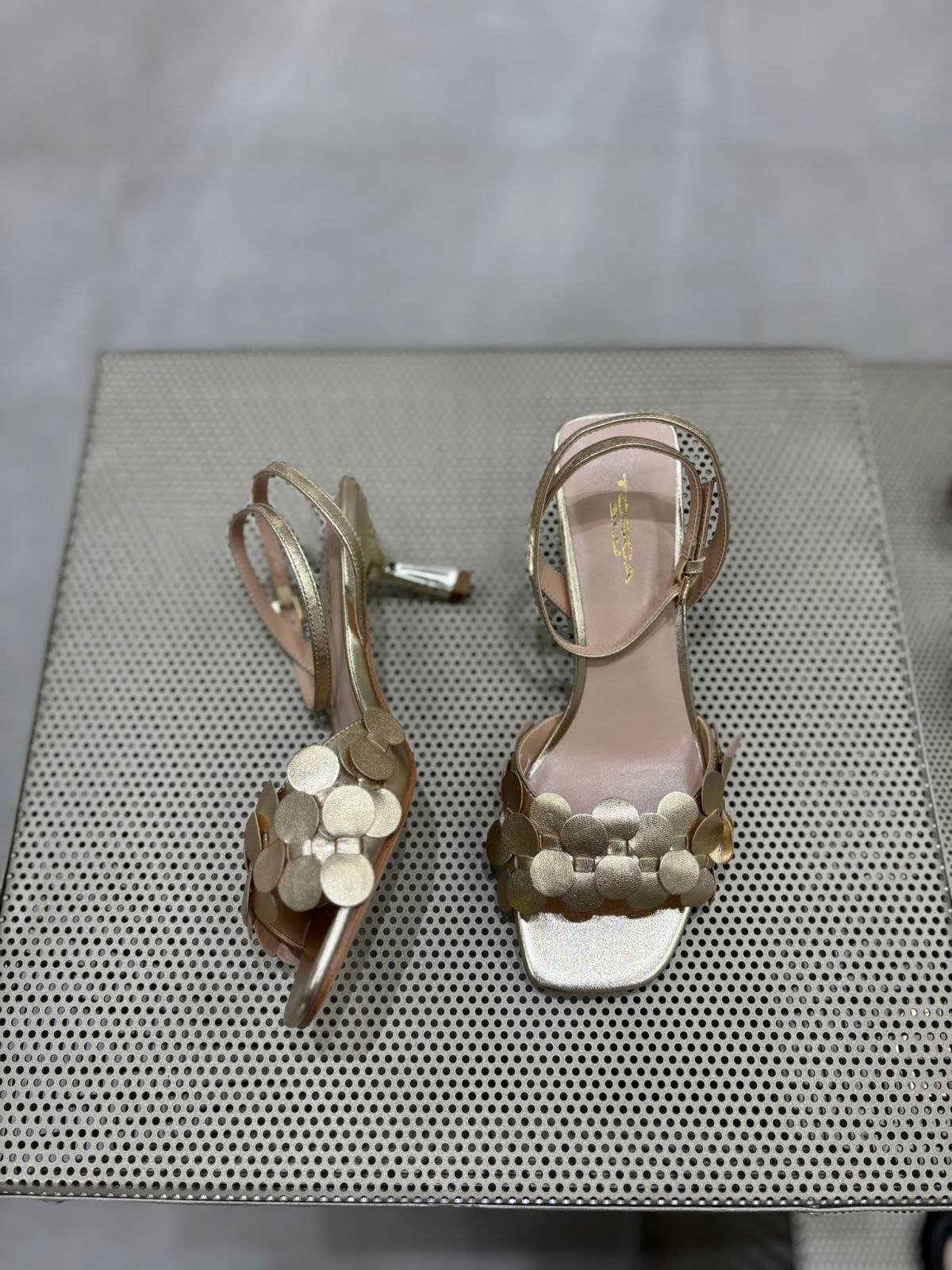 Sandale de dama confectionate din piele naturala, cu toc jos de 5 cm metalic. Se ajusteaza pe picior cu ajutorul unei barete subtiri cu catarama. Comode si foarte versatile, aceste sandale sunt accesoriul potrivit vara aceasta potrivite si la un eveniment.